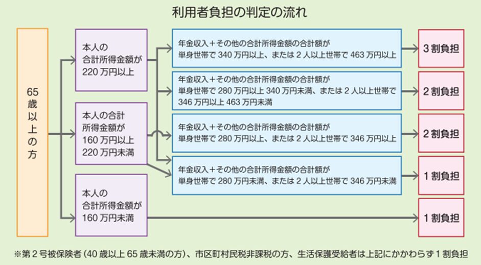 自己負担は「合計所得金額」と「65歳以上の世帯人数」で決まり、年金収入(遺族年金・障害年金を除く)も含まれます。