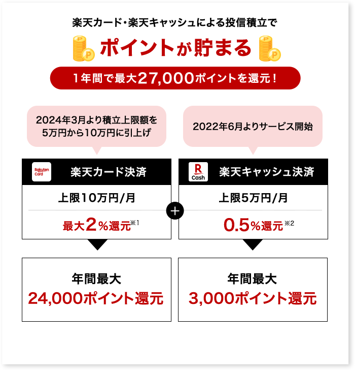 さらに、楽天キャッシュと併用することで、毎月最大15万円まで積立投資が可能です。