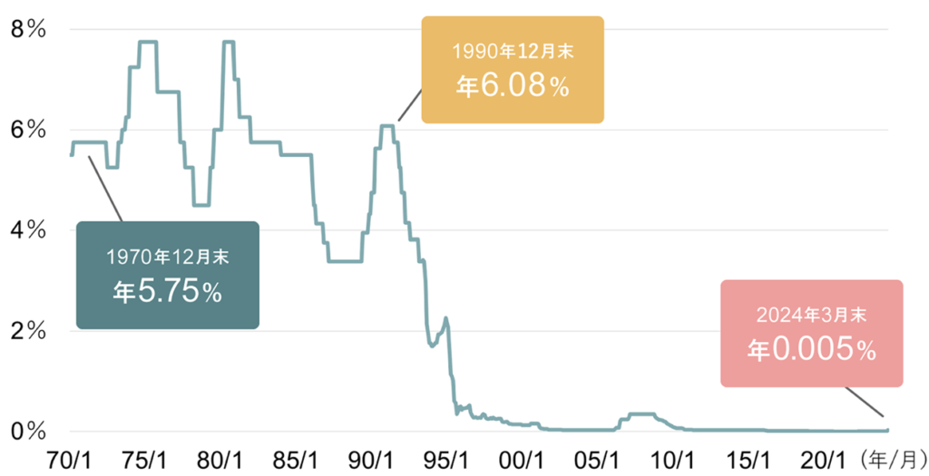 図1は、戦後からの金利の推移を示していますが、直近の2024年はわずか0.005%となっています。